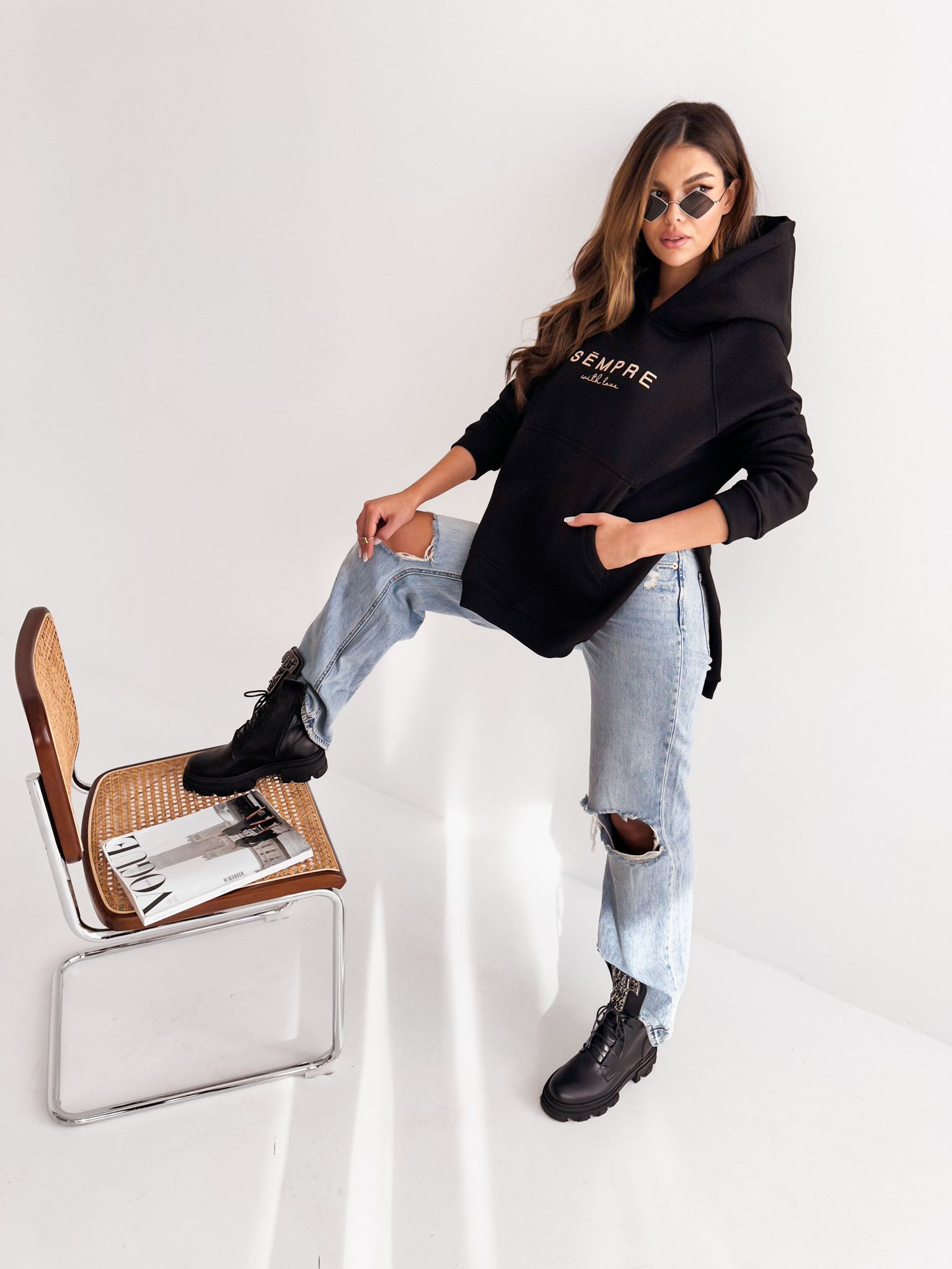 Oversized hoodie. Large hood and pocket. Two slots on the sides. With logo embroidery.
