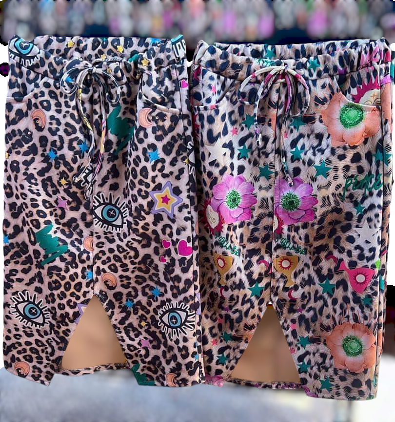 Panther pils með litríku mynstri með teygjanlegu bandi við mitti og streng.