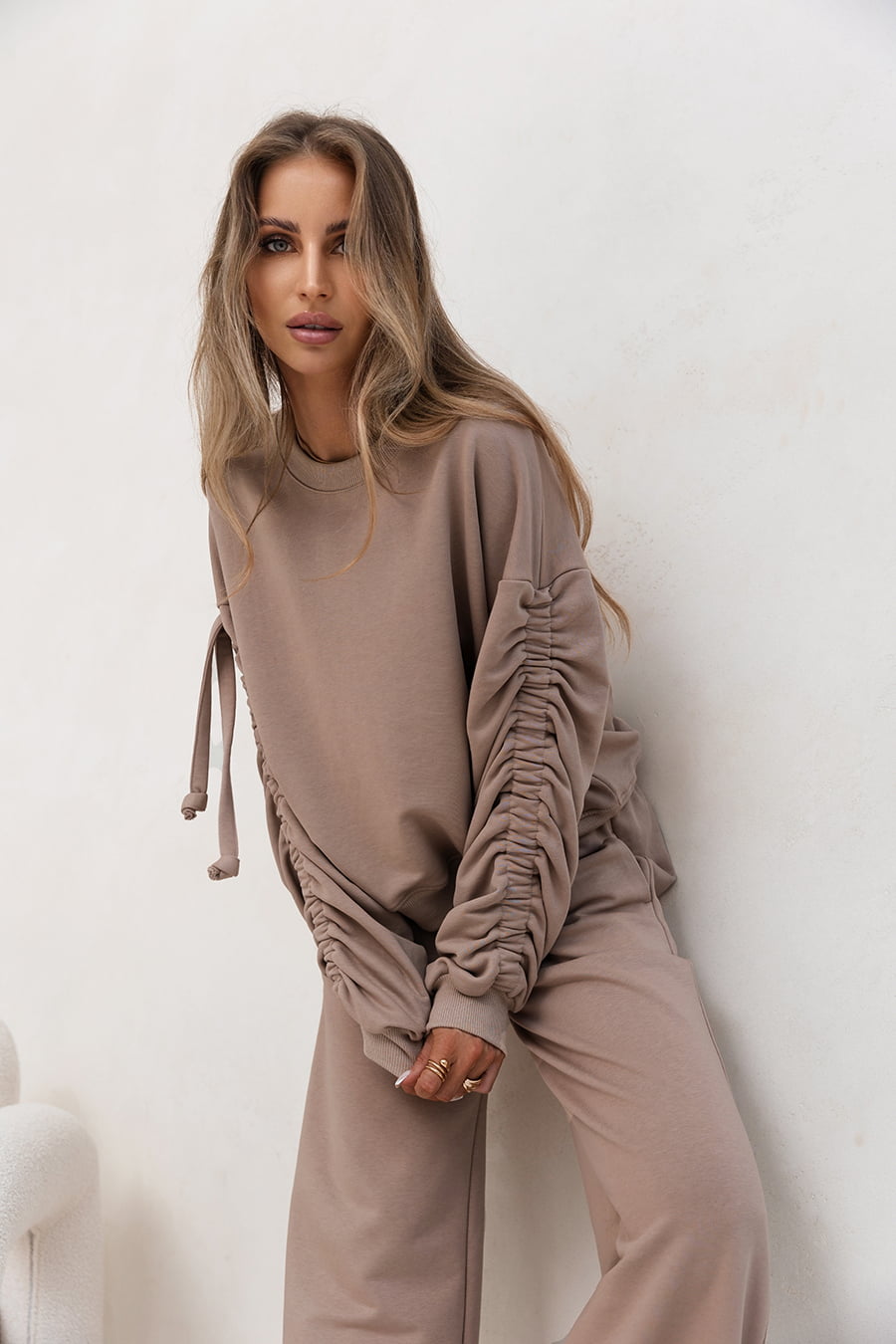 Bluza z kapturem. Luźny krój. Ozdobne podwijane rękawy z mankietami. Starannie wykończone.