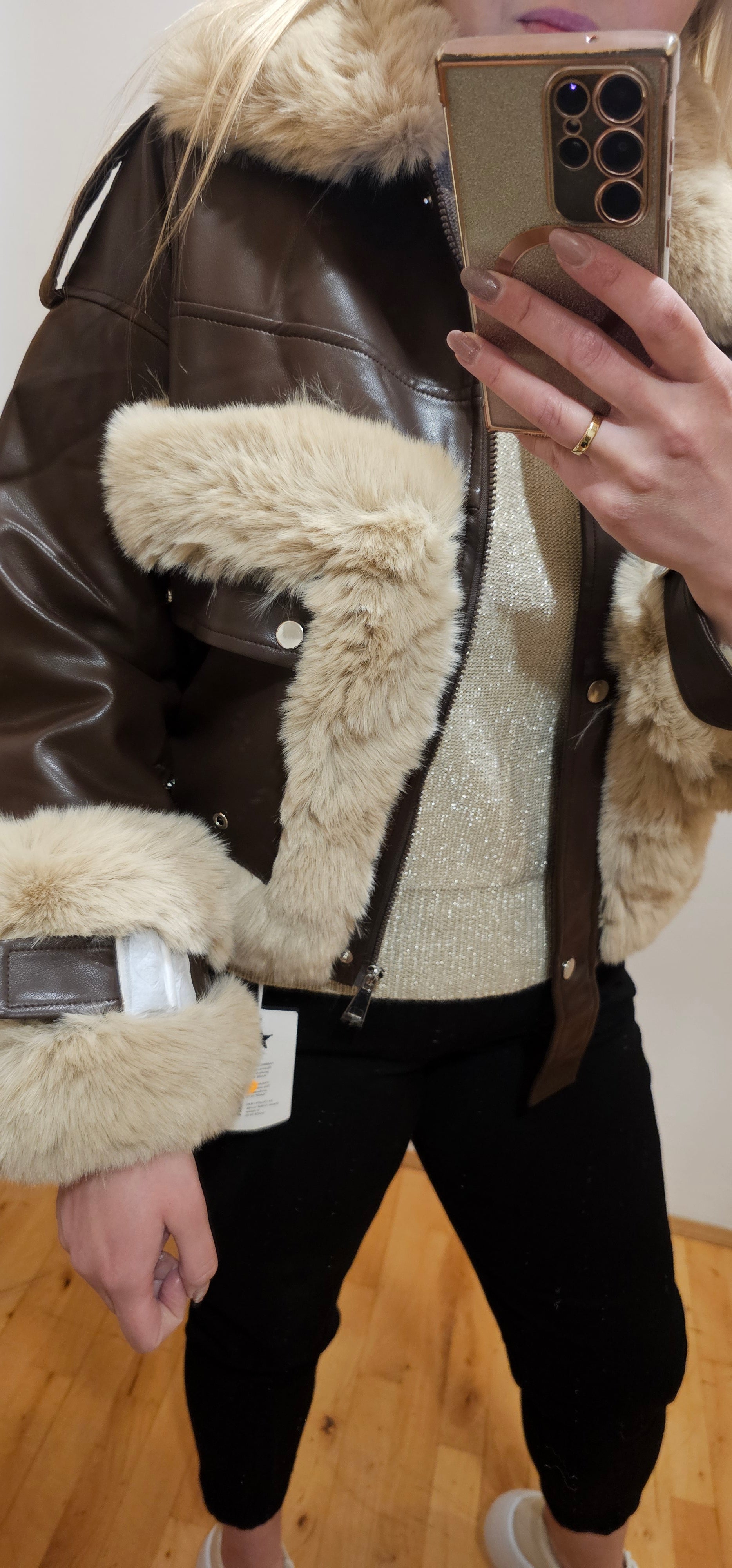 Stílhrein hlý milja jakka, innblásin af klassískum Ramones, er frábært val fyrir alla unnendur tískusölu. Búið til úr vistvænum leðri í glæsilegum svörtum, brúnum eða beige skugga, það tryggir ekki aðeins einstakt útlit, heldur einnig hágæða. Hönnun þess sem ekki er samsett gerir þér kleift að klæðast henni bæði á köldum dögum og á vægum hitastigi, en tryggja hámarks notkunarhæfingu. Innrétting jakkans hefur verið búin fóðri, sem eykur enn frekar endingu og styrk. Ermarnar, vasarnir og kraginn hafa verið skreyttir með mjúkum, beige skinn, sem gefur öllu glæsilegri og lúxus karakter!