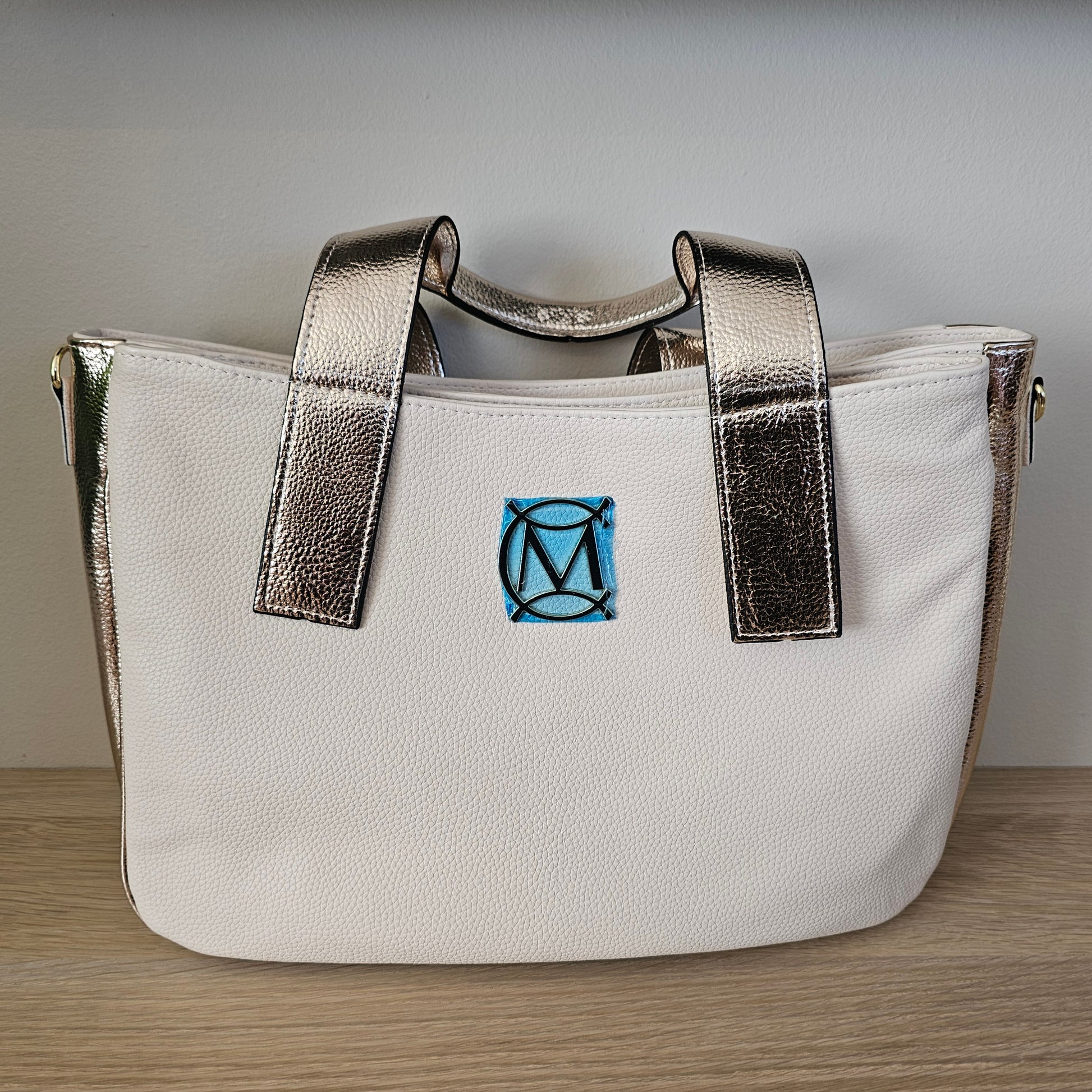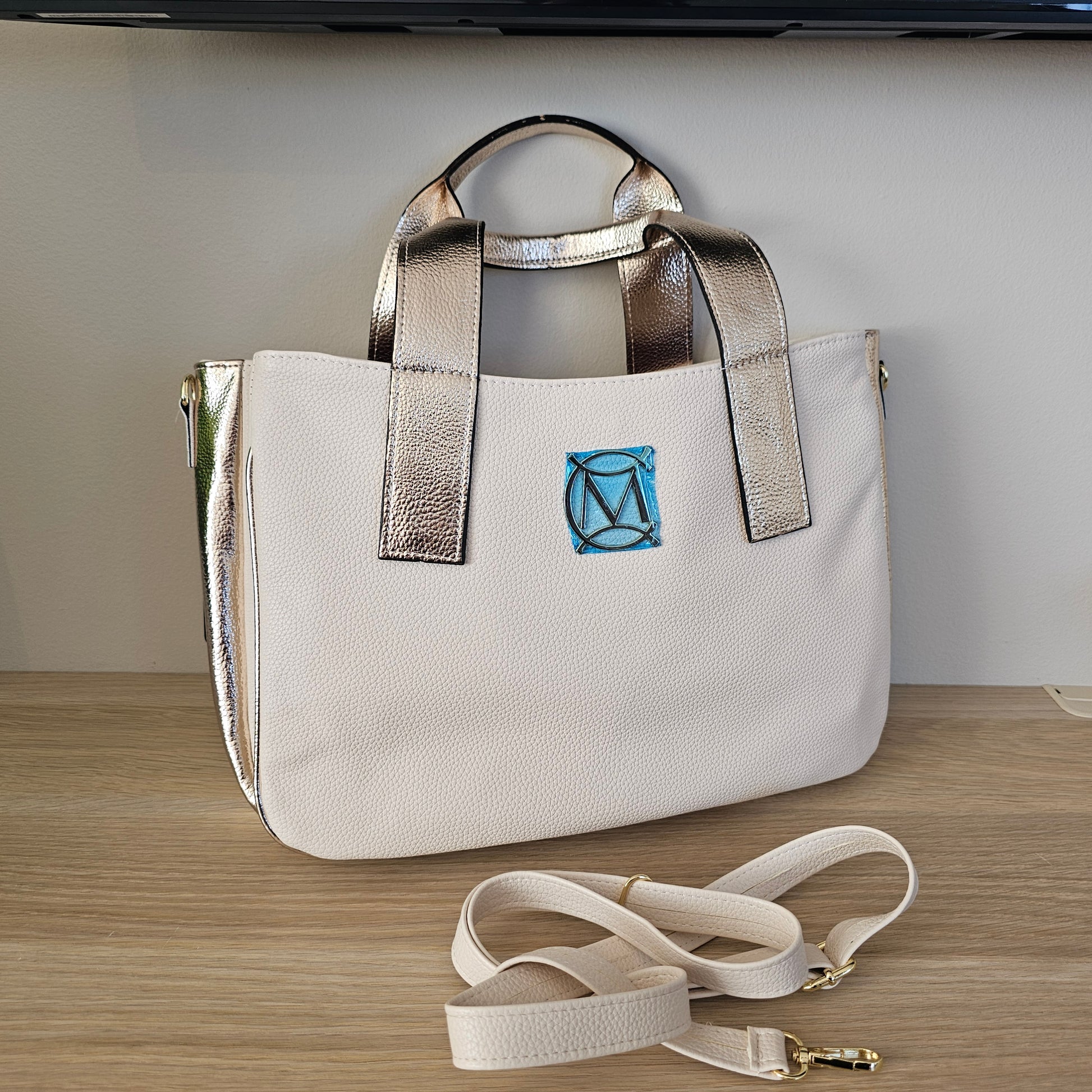 Ítalskur handtösku eða öxl úr vistfræðilegu leðri með gullnum höndum.
