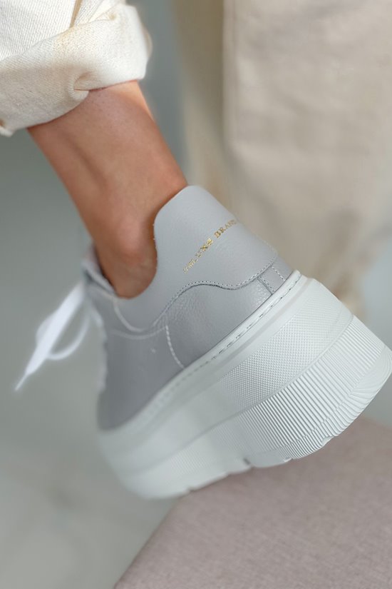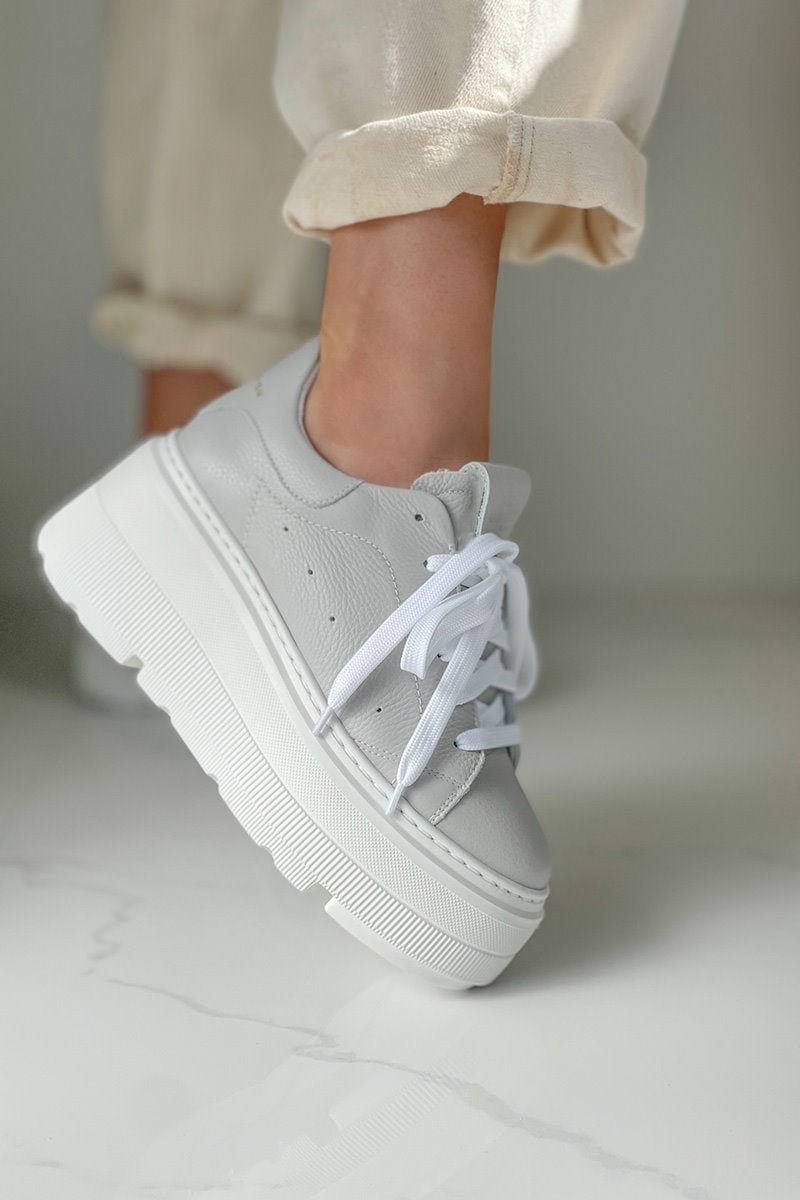 Strigaskór á háum vettvangi eru skófatnaður sem einkennist af blöndu af klassískri hönnun íþróttaskóma með smart hreim í formi hás, trausts sóla. Skórnir eru úr hágæða hvítu náttúruleðri.